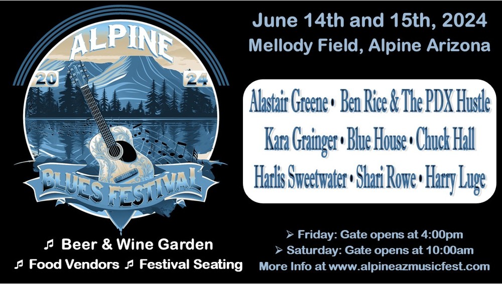 Greetings from Alpine! It is with great excitement that we announce the 2024 Alpine Blues Festival. Please join us as we return to Mellody Field on June 14th and 15th, 2024. Let the music ring from the mountaintops as we welcome some incredible Country and Blues musicians for this two-day event.