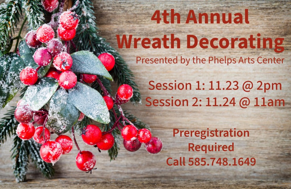 Come join us for a magical session of wreath decorating at the Phelps Arts Center. Let your imagination run wild as you create your own one-of-a-kind holiday masterpiece. We provide the greenery and a variety of materials, or you can bring your own special ornaments to personalize your wreath. Don't miss out on this festive opportunity to get into the holiday spirit and craft a beautiful decoration for your home!