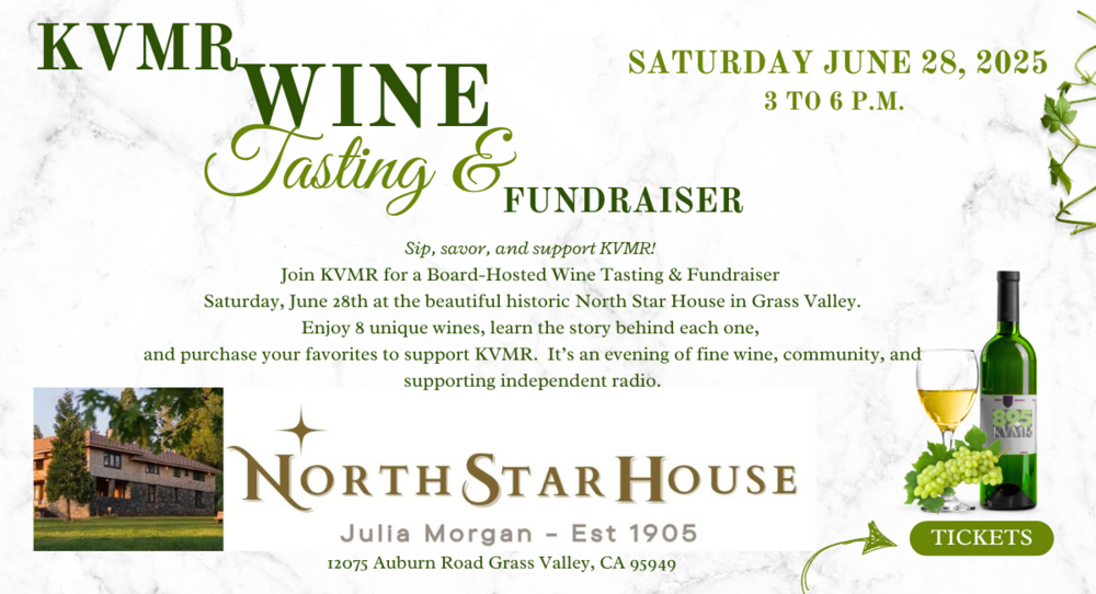 Raise a glass to community radio at KVMR's Board-Hosted Wine Tasting and Fundraiser! Join us on Saturday, June 28th at the Historic North Star House in Grass Valley for a unique evening of flavor, music, and connection. Sample 8 different wines, learn about each one from our expert hosts, and purchase your favorites to support KVMR. It's an unforgettable experience that combines the best of wine tasting with the joy of giving back. Tickets are on sale now at kvmr.org. Don't miss out on this opportunity to savor great wines and support a vital community resource!