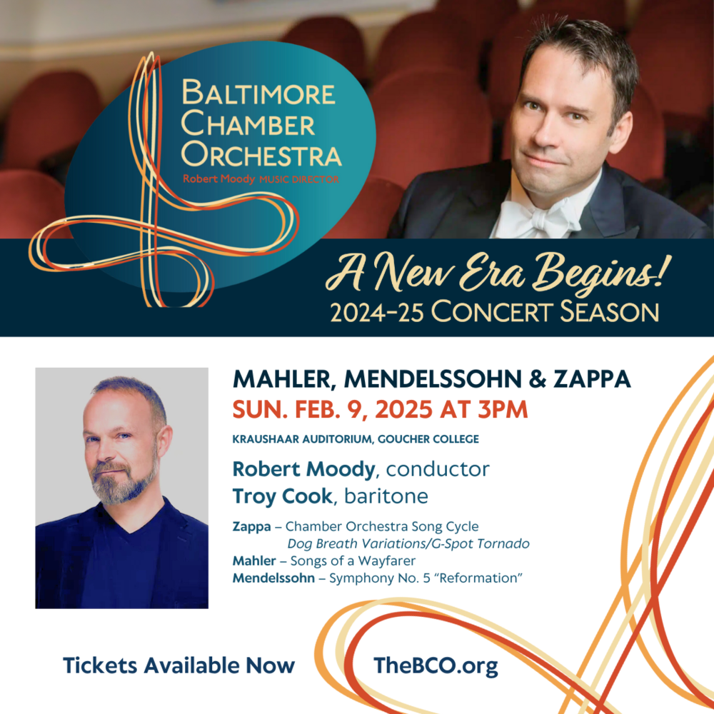In another program of firsts, the BCO highlights Baltimore born Frank Zappa’s compositional ingenuity before Metropolitan Opera baritone Troy Cook brings his acclaimed interpretation of Mahler’s enigmatic Songs of a Wayfarer to the stage. Mendelssohn’s majestic “Reformation” Symphony brings the concert to a dramatic finish.
