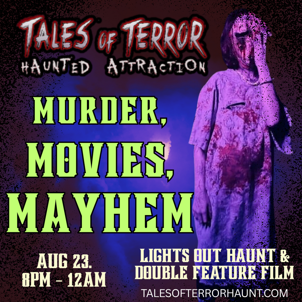Step into total darkness with our lights out haunted trail- where the only thing guiding you is a glowstick and your own screams. Not into being chased? No worries. Cozy up on haunted church pews, snack in hand, and catch our FREE outdoor double feature on a 25-ft screen.