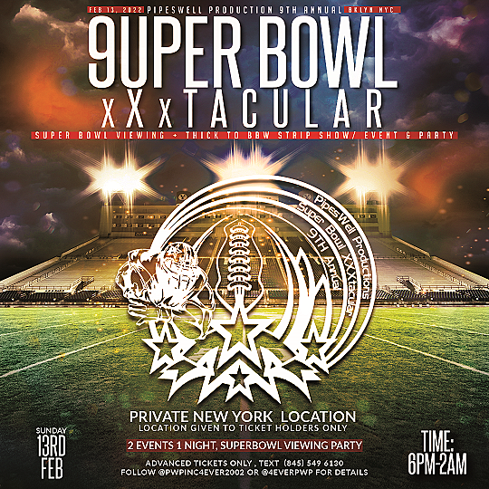 Join us Sunday Feb 13th in NYC, not Only celebrating Our 9th Annual PipesWell Productions 9UPER BOWL xXx-tacular, but More importantly We Celebrate Thick to BBW & SSBBW woman and the Lovers and Supporters of them. The 9th Annual PipesWell Productions 9UPER BOWL xXx-tacular, Hosted by 30 Thick to BBW Performers, Strippers, Porn Stars and Adult entertainers. Along with [Fire🔥Show/Water💧Shows/ Oil Shows/ and More}