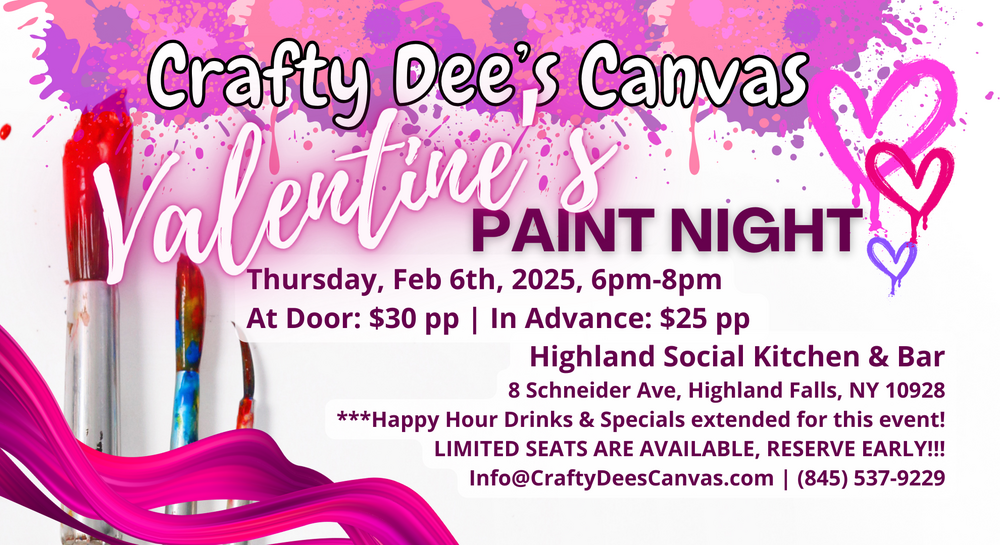 Get ready to unleash your creativity at our Valentine's Paint Night, one of many “Love Is in the Air” Activities this month! We will meet on Thursday, Feb 6th, 2025 at Highland Social Kitchen & Bar located at 8 Schneider Ave, Highland Falls, NY.