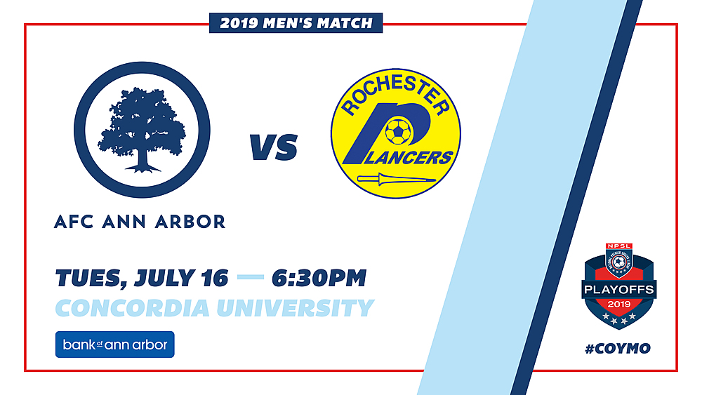 Association Football Club Ann Arbor will host the Rochester Lancers in the Midwest Region Quarterfinals of the National Premier Soccer League on Tuesday, July 16th at 6:30PM at Concordia University Ann Arbor.