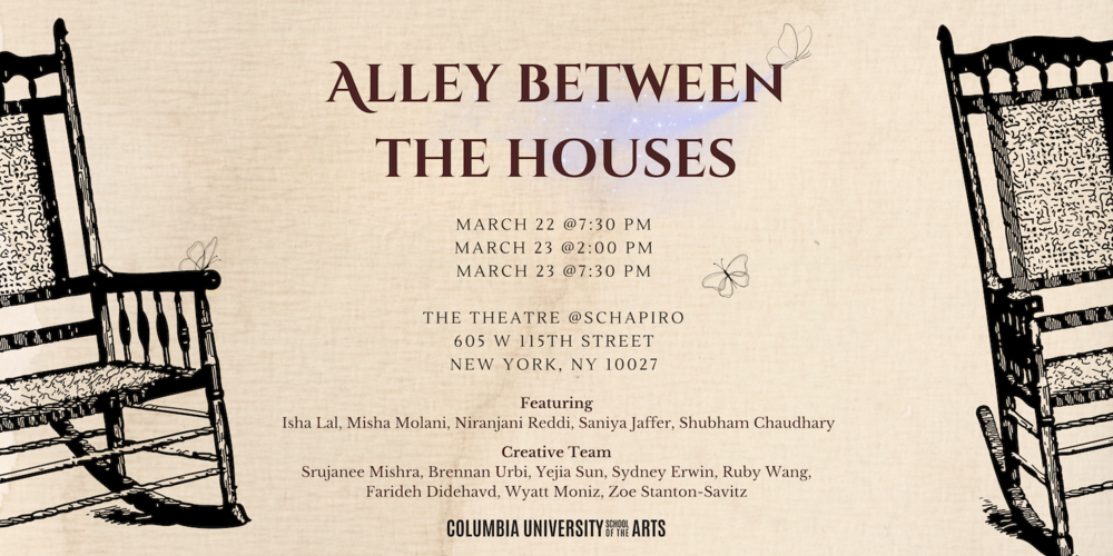 Alley Between the Houses tells the tale of three sisters who visit their childhood home. In this house, time appears to have come to a standstill and old memories come haunting back. Long-buried childhood fantasies emerge as Hera, Shani and Zera encounter the Butterfly Boy who lives in the alley, and their nanny, Dai Maa, who now lives in the mango tree. What do they remember? What have they forgotten? What is long gone? And what stays? The sisters are forced to face their decaying relationships with the house and each other.