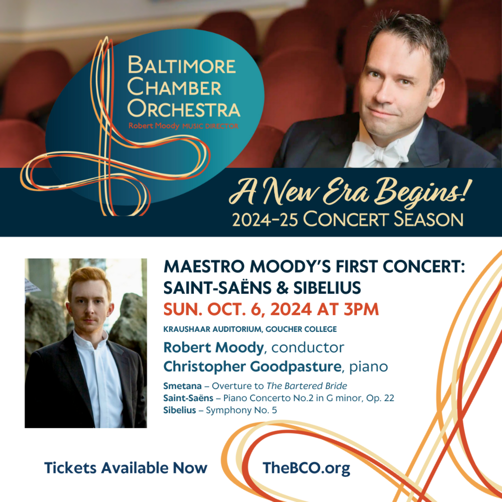 Robert Moody begins his tenure as Music Director with three well-known works each receiving their first BCO performances. Smetana’s rousing operatic overture opens the program before Peabody DMA candidate Christopher Goodpasture performs Saint-Saëns’ most popular piano concerto. Sibelius’s ethereal and moving Symphony No. 5 offers a sign of musical adventures ahead under Maestro Moody’s leadership.