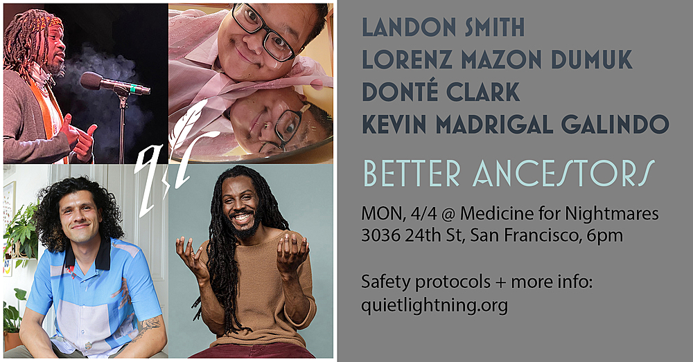 Quiet Lightning presents the sixth Better Ancestors, featuring readings and performance by Kevin Madrigal Galindo, Landon Smith, Lorenz Mazon Dumuk and Donté Clark!