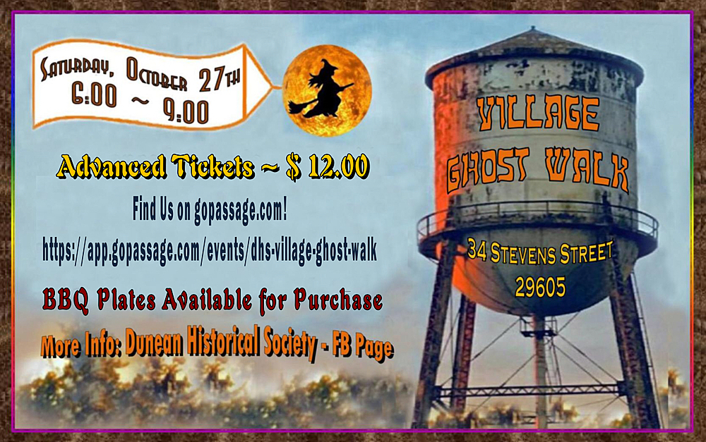 Join us on our first Village Ghost Walk. This tour will visit sites of some of Dunean's most haunted areas and provide all with stories and a history of the darker side of this mill village in close proximity to our beautiful downtown Greenville.Tickets and time slots are limited, with groups of 15 leaving every 20 minutes. Purchase tickets early to ensure your preferred time slot. BBQ plates and tractor churned ice cream are available for purchase, as well. Advanced ticket sales only-no Ricky sales day of event.