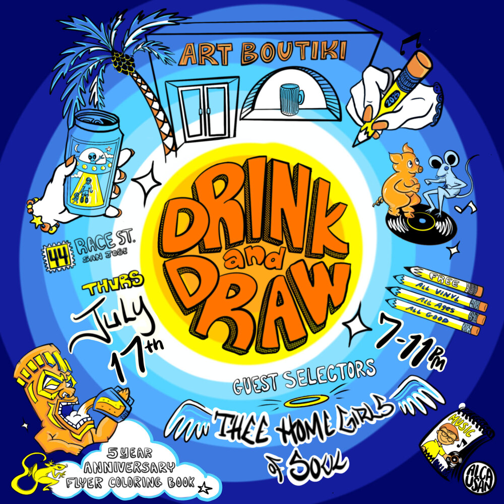 This month's Drink and Draw is also a five-year anniversary celebration of this version of the Art Boutiki Drink and Draw hosted by Alca and Carlos. Since 2018 (two years off due to COVID), they have helped make one of the longest-running Boutiki events a success. To celebrate, a special, limited-edition coloring book will be available for purchase, featuring flyers from the past five years.
