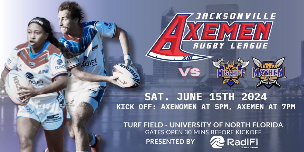 Come out to the University of North Florida on Saturday, June 15th for the Jax Axe double header home opener. The Jax Axe Women will take on the Tampa Mischief at 5pm and the Jacksonville Axemen will take on the Tampa Mayhem at 7pm.