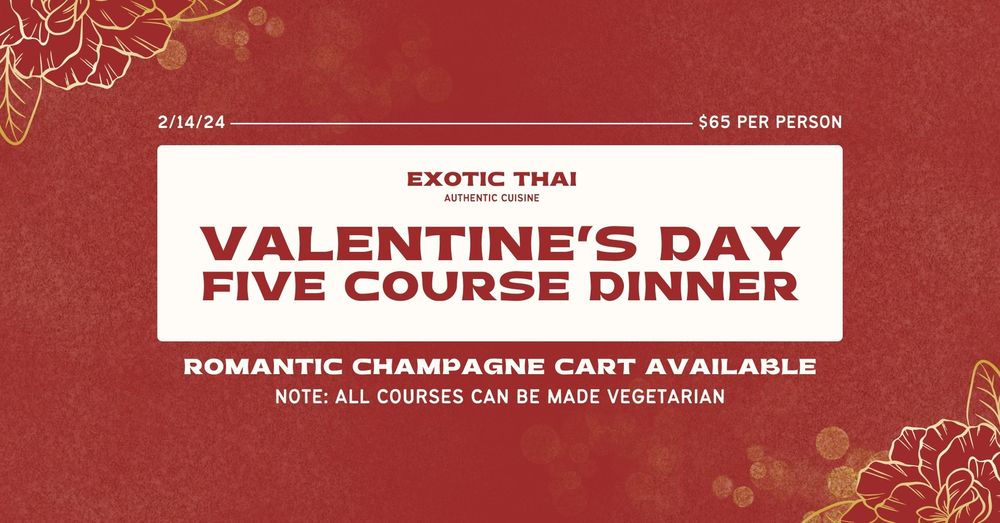 Join us for a night of romance and exquisite flavors at this special Valentine's Day event. Indulge in a decadent 5-course meal carefully curated for you and your Valentine. Enhance the experience with our Champagne Cart, available by the glass or bottle. Of course, our Exotic Thai drink list will also be available, ensuring a perfect pairing for every course.