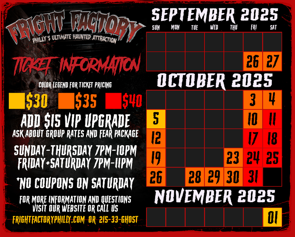 If for some reason Fright Factory is forced to close. Your tickets will be honored any other Operating Night in 2025 season.