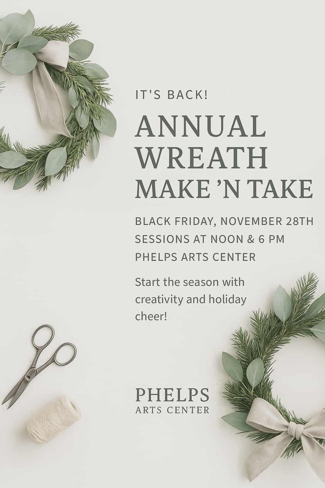 Come join us at the Phelps Arts Center for a festive holiday celebration like no other. Dive into the spirit of the season by creating a stunning wreath that reflects your personal style and festive spirit at our 4th annual DIY Wreath Decorating event.