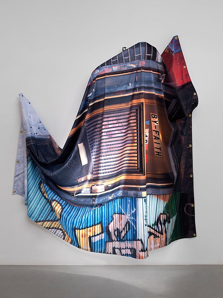 Baseera Khan By Faith (Front Door), 2020 Polyester Matte backdrop, grommets, wood, foam, muslin, microphone stand, and selfie light