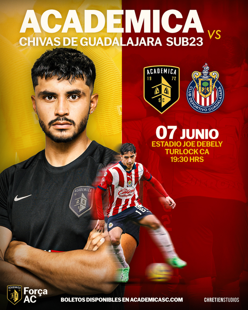 Tu equipo Academica SC da la bienvenida a las Chivas de Guadalajara Sub 23 para un partido amistoso este verano. El partido se jugará en el estadio Joe Debely de Turlock High School el 7 de Junio alas 7:30 PM. Este emocionante partido dará la oportunidad a nuestros jugadores de enfrentarse contra uno de los equipos más populares de Mexico! No te pierdas las oportunidad de disfrutar este encuentro aquí mismo en valley central.