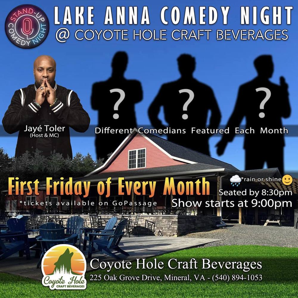 Join us at Coyote Hole Ciderworks for a night of laughter and great entertainment with our favorite comedian host, Jayé Toler! Our lineup is filled with new and accredited talent that will make you laugh until you cry. We guarantee a high quality, professional show that will leave you thoroughly entertained. Be sure to arrive by 8:30pm to get your seats before the show starts at 9pm.