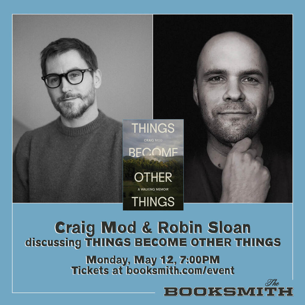 The Booksmith is thrilled to be welcoming Craig Mod to The Booksmith for the Things Become Other Things on May 12th at 7pm. He'll be in-conversation with Robin Sloan. Please join us! RSVP is not required, but appreciated. Seats are limited and can be guaranteed with the purchase of a book.