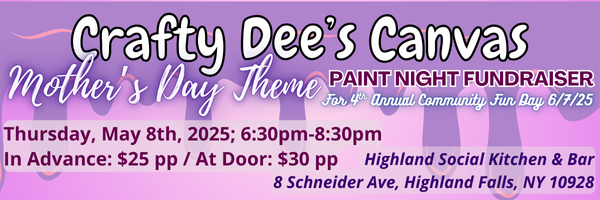 Join us on Thursday, May 8th, 2025, at Highland Social Kitchen & Bar located at 8 Schneider Ave, Highland Falls, NY, for a special Mother's Day Paint Night event! Come together with friends and family to honor that special female in your life while enjoying a night of painting led by Crafty Dee's Canvas' owner, Dee Dee, from 6:30pm - 9:30pm.