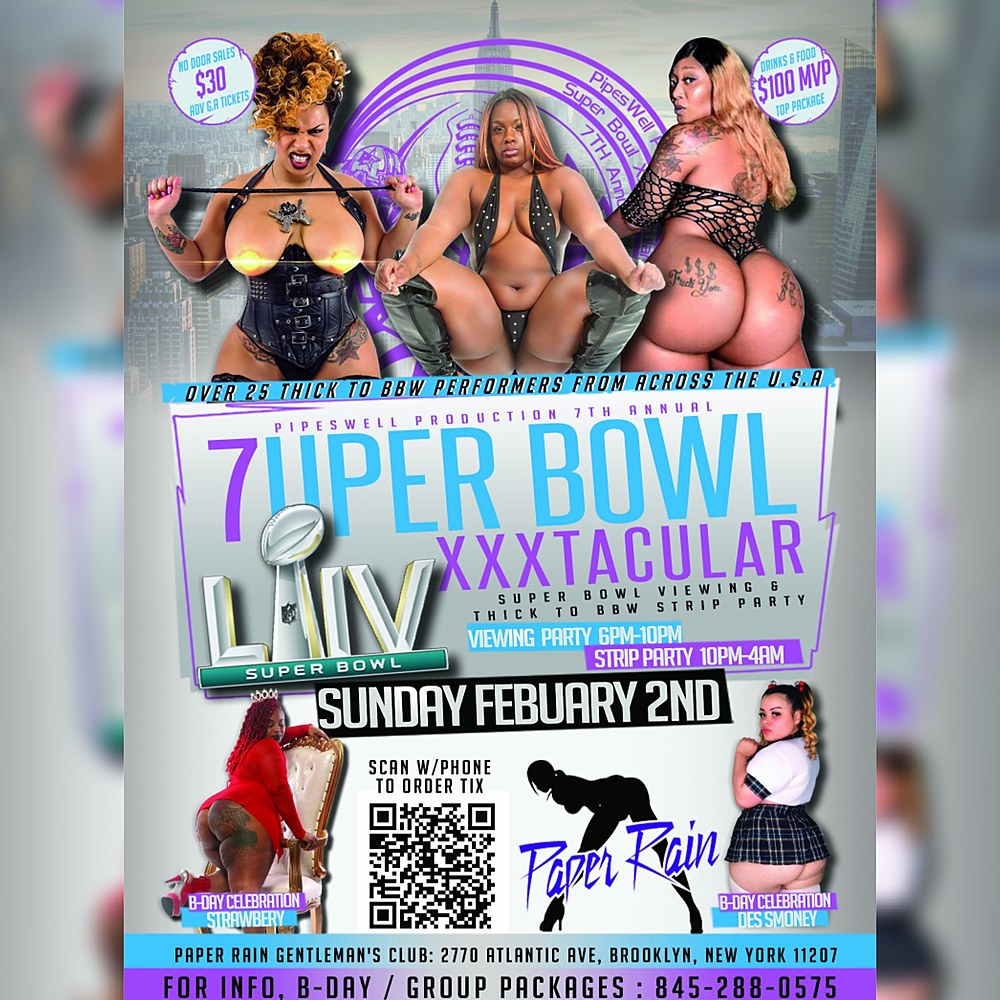 Join us Sunday Feb 2nd in NYC, not Only celebrating the 7th Annual PipesWell Productions 7UPER BOWL xXxtacular, More imporantly we celebrate Thick to BBW woman and the Lovers and supporters of them. the 7th Annual PipesWell Productions 7UPER BOWL xXxtacular, Hosted by 20 Thick to BBW Performers, Strippers,Porn Stars and Adult entertainers. For any Questions, Concerns or Comments OR to Arrange Birthday Party and Group Packages please contact us on our platforms.