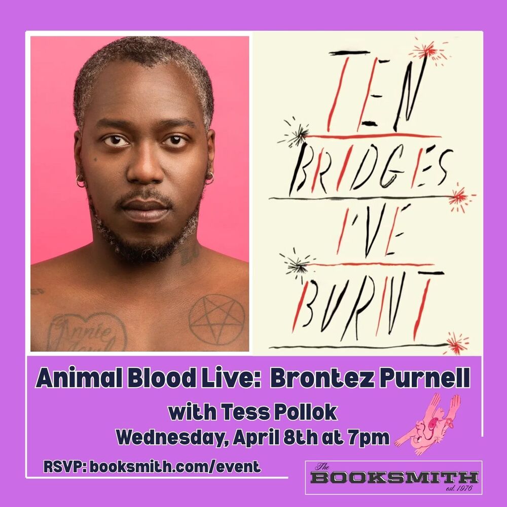 Join us on Wednesday, April 8th at 7:00 PM for a conversation with Bay Area author Brontez Purnell and Animal Blood Magazine editor Tess Pollok on Purnell's recent memoir, Ten Bridges I've Burnt, and a discussion of his writing practice and inspirations. A 2022 Lambda Literary Award prize-winner, Purnell cuts a hard-to-pin-down figure in the literary scene, oscillating between fiction, prose, poetry, and memoir to write contemporary stories about sex, trauma, family drama, Blackness, and boyfriends. RSVP is not required, but appreciated. Seats are limited and can be guaranteed with a $3 sliding scale donation to our program.