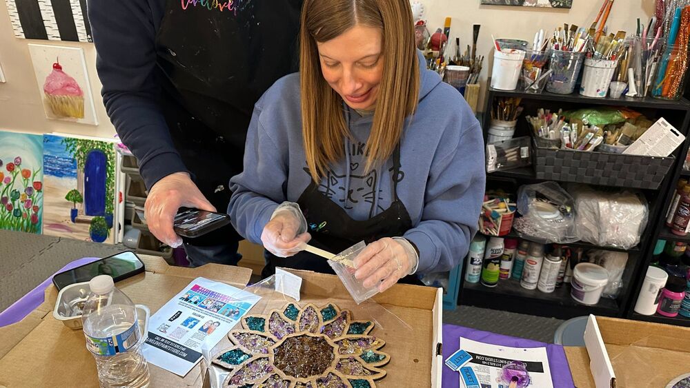 These pieces are super relaxing and fun to make! Crafted with a wooden frame, crushed glass, and resin, once cured, they become a permanent faux stained glass masterpiece that you can enjoy for years to come. Each piece is one of a kind, created by you, and you get to choose all the colors you want!