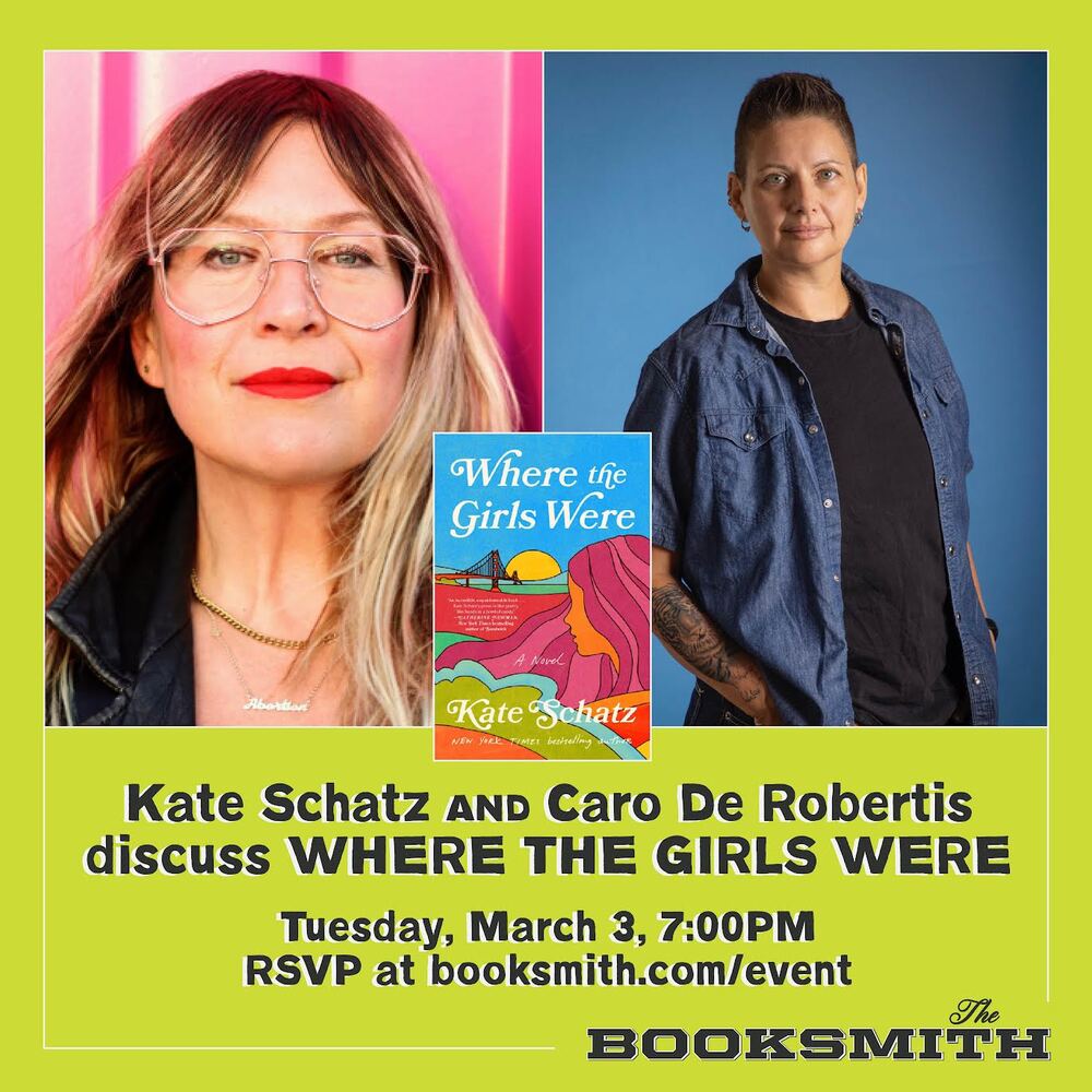 Join us on Tuesday, March 3rd at 7pm as we welcome Kate Schatz back to The Booksmith for WHERE THE GIRLS WERE. She will be joined in conversation by Caro de Robertis. RSVP is not required, but greatly appreciated. Seats can be reserved with a sliding scale donation to our program or the purchase of a book.