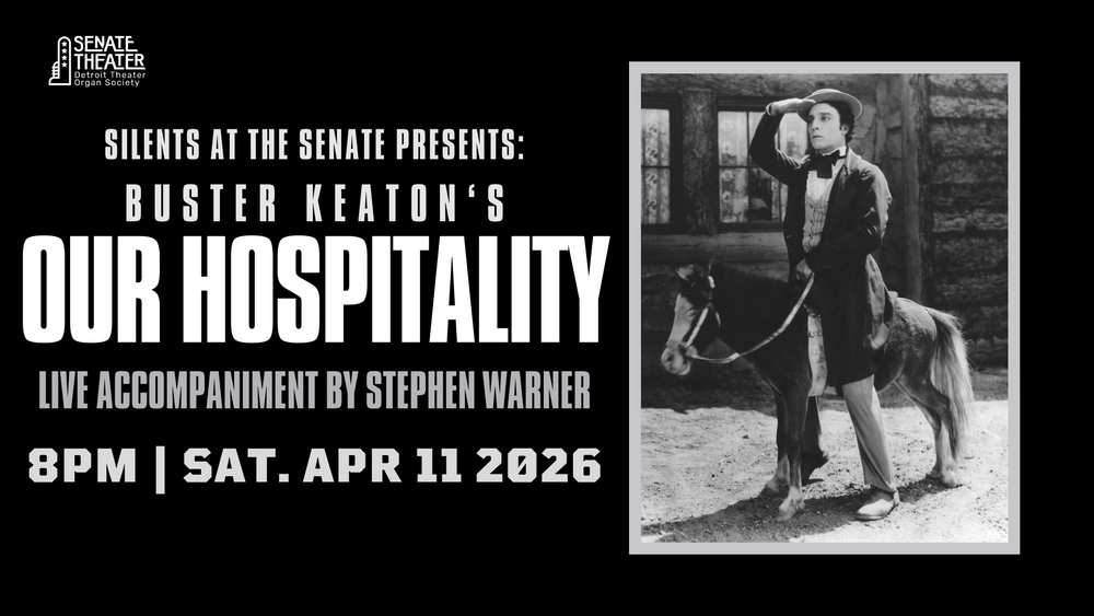 Silents at the Senate continues its 2026 season with actor/director Buster Keaton’s seminal silent comedy, Our Hospitality. Live musical accompaniment will be provided by Stephen Warner on the Senate’s Mighty Wurlitzer theater pipe organ, the eighth largest instrument of its kind ever constructed!