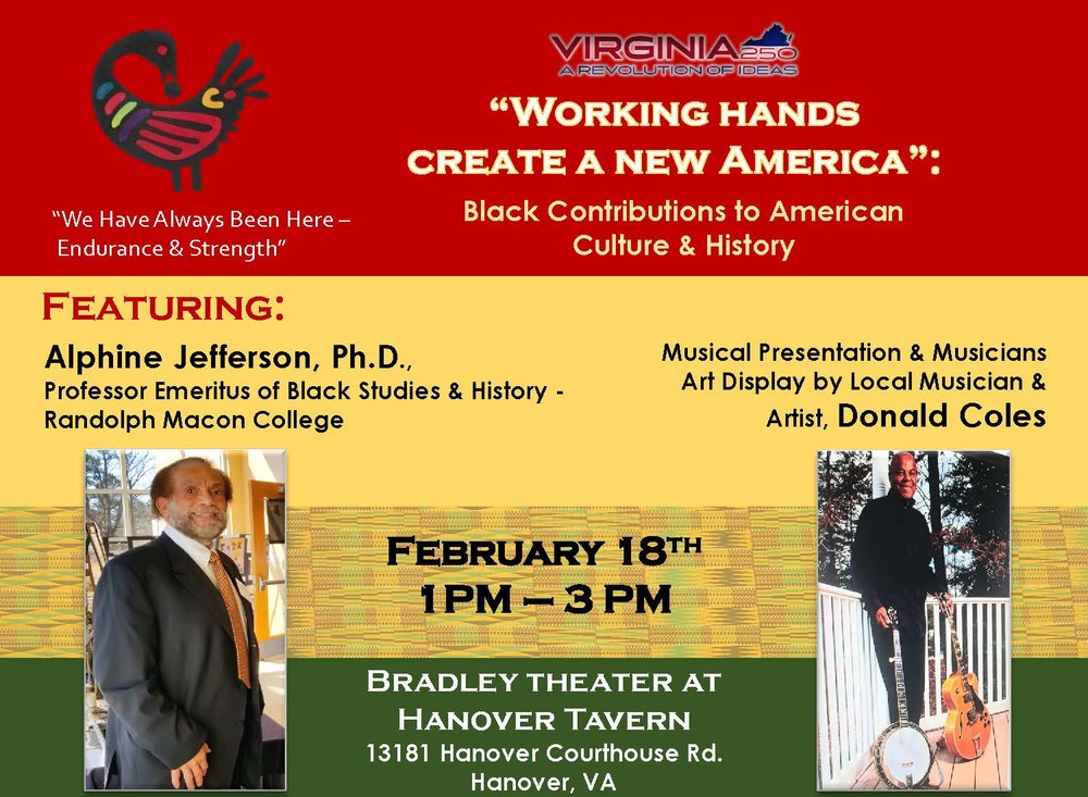 Featuring a discussion on black contributions to American culture and history by Alphine Jefferson, PhD., Professor Emeritus of Black Studies and History at Randolph Macon College and a musical presentation and artwork display by Local Recording Musician & Artist, Donald Coles.
