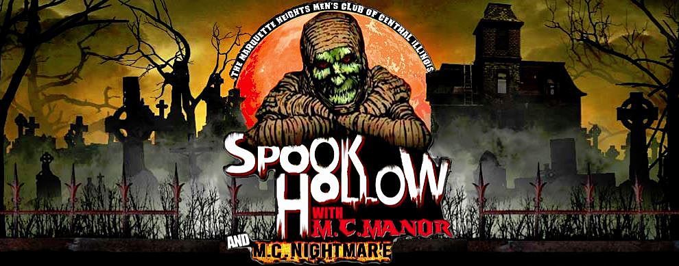 The longest running "Outdoor Haunted Attraction" in the State of Illinois. Over 40 Years of scaring Central Illinois, the Marquette Heights Men's Club of Central IL presents three truly horrifying events for one admission price. Spook Hollow, the one that started it all will lead you deep into the woods of Independence Park. M.C. Manor, a spine-tingling haunted mansion with movie quality rooms, provide the scare factor you crave. If that isn't enough, M.C. Nightmare will lead you through a twisted and run-down industrial haunt destine to claim as another lost soul deep within its rusty walls. The three haunts combine to bring you a "Trilogy of Terror" for one admission price.