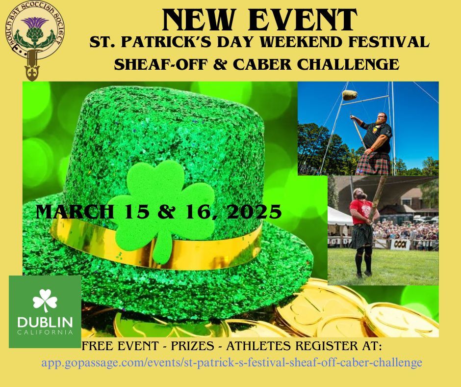 South Bay Scottish Society is pleased to announce a whole NEW Celtic Highland competition event, partnered with the City of Dublin, in Dublin, California March 15th & 16th, 2025 located at the Dublin Civic Center (Sports Fields)100 Civic Plaza, during the Dublin St. Patrick's Day weekend celebrations. Lots of festivities: vendors, animals, live music and most importantly, Sheaf for Height and Caber Challenge. This event gets bigger and bigger each year and draws thousands of people.
