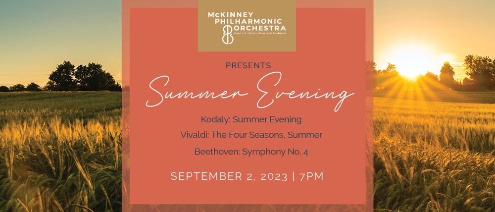 Join us for an unforgettable night of music as The McKinney Philharmonic Orchestra opens its 2023-2024 season with a bang. As the scorching heat of the Texas summer fades away, we bid farewell to the season with a stunning performance of Kodaly's Summer Evening. Following will be Vivaldi’s The Four Seasons, Summer, performed by Marina Dichenko (Concertmaster), Yesenia Campos Wong, and Yulia Petkevich.