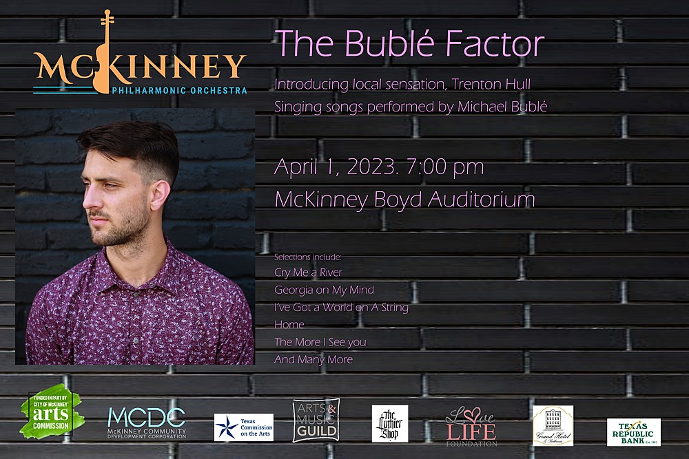 Meet local sensation and crooner, Trenton Hull dazzle you with his smooth voice performing hits from Michael Bublé's collection of recordings. Trenton will be accompanied by the McKinney Philharmonic Orchestra.