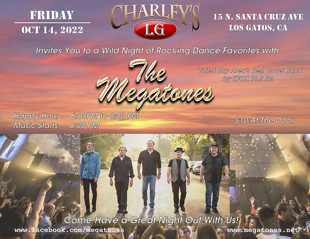 Join The Megatones as we return to Los Gatos hosting wild, rambunctious party at that historical landmark of great night life, Mountain Charley's Saloon, now known as "Charley's LG." We'll feature many new songs, special guests, and lots of fun surprises. Dancing starts at 8:30 PM.