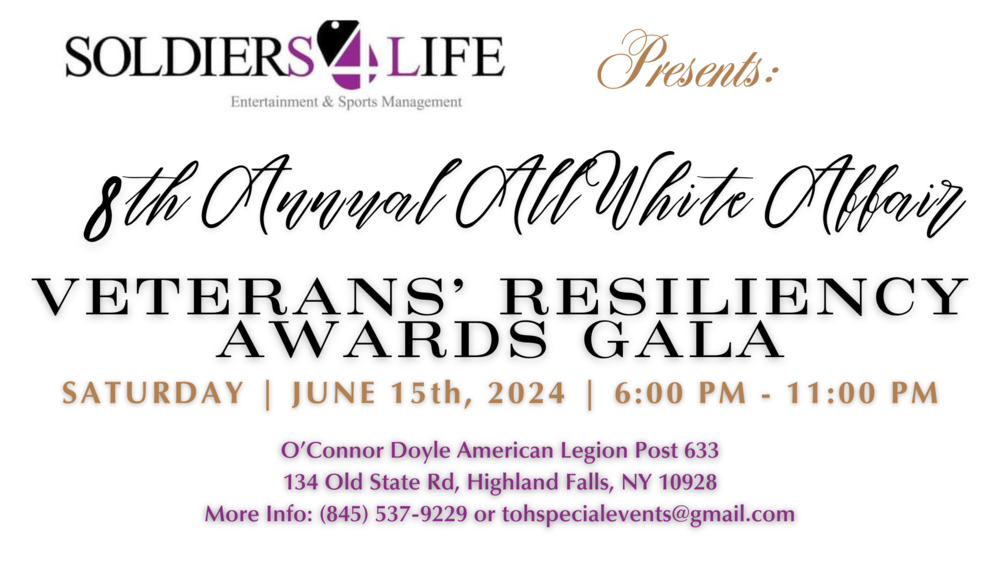 Come and experience the 8th Annual S4L Veteran’s Resiliency All White Affair & Awards Ceremony, dedicated to raising awareness and preventing Veterans Suicide & Homelessness. This event is the culmination of a personal mission by Retired Army CSM Ty King, who served over 30 years in the US Army. We are proud to recognize veterans who have exemplified resilience, inspiring our community and future generations.