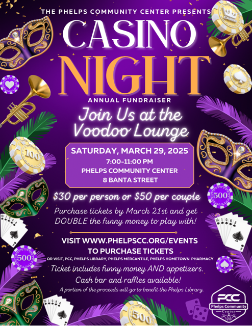 Join us at the Voodoo Lounge for Casino Night on March 29th from 7-11pm! You'll be supporting the PCC. Dress the part or come as you are and enjoy casino games, appetizers, live music, great company and so much fun! Cash bar will be available. Pre-sale tickets include double the funny money to play casino games with ($5000). Limited tickets available.